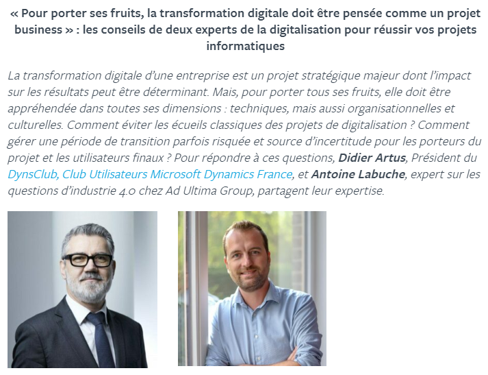Interview croisée, Didier Artus, Président du DynsClub, Club Utilisateurs Microsoft Dynamics France, et Antoine Labuche, expert sur les questions d’industrie 4.0 chez Ad Ultima Group_