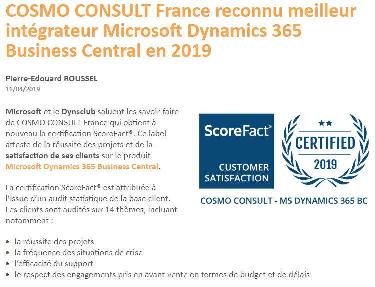 Microsoft et le DynsClub saluent les savoir-faire de COSMO CONSULT France qui obtient à nouveau la certification ScoreFact®. Ce label atteste de la réussite des projets et de la satisfaction de ses clients sur le produit Microsoft Dynamics 365 Business Central._