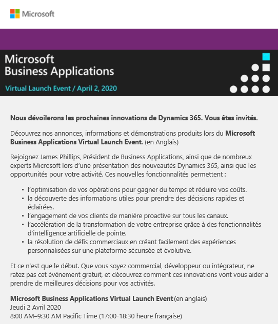 Participez le jeudi 2 avril au lancement « Virtuel » de la nouvelle release Dynamics 365. Découvrez les annonces, informations et démonstrations produits lors de cet événement.