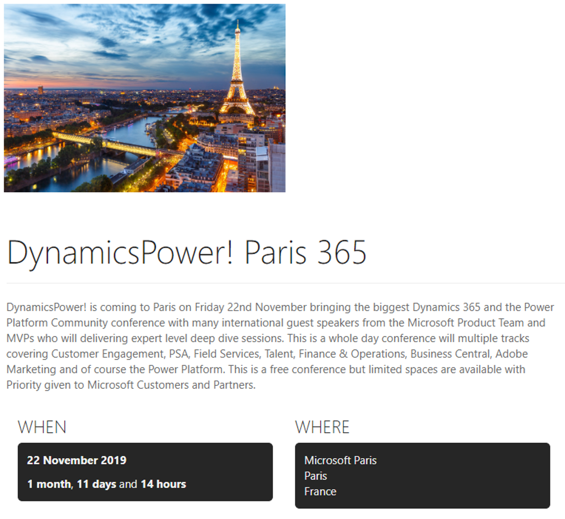 Le 22 novembre 2019 le Dynamics Power se déroulera à Paris. Il s’agit d’un événement technique et stratégique gratuit organisé par les MVP de la communauté Microsoft Dynamics. Au cours de la journée des experts techniques partageront leurs expériences, les nouveautés et les bonnes pratiques autour des solutions Dynamics 365 et Power Platform