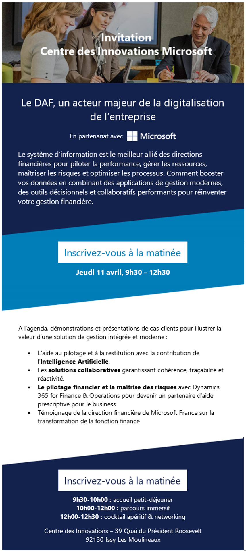 Hitachi Solutions vous invite le jeudi 11 avril au Centre des Innovations Microsoft, pour une matinée consacrée à la « Modern Finance ». Lors de cet événement démonstrations et présentations de cas clients illustreront la valeur d’une solution de gestion intégrée et moderne pour les Directions Financières._