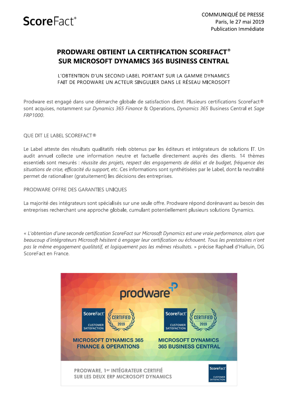 PRODWARE obtient la Certification ScoreFact® sur Microsoft Dynamics 365 Business Central. Celle-ci vient s’ajouter à la Certification déjà obtenue sur Dynamics 365 Finance & Operations. Prodware répond dorénavant au besoin des entreprises recherchant une approche globale, cumulant potentiellement plusieurs solutions Dynamics._