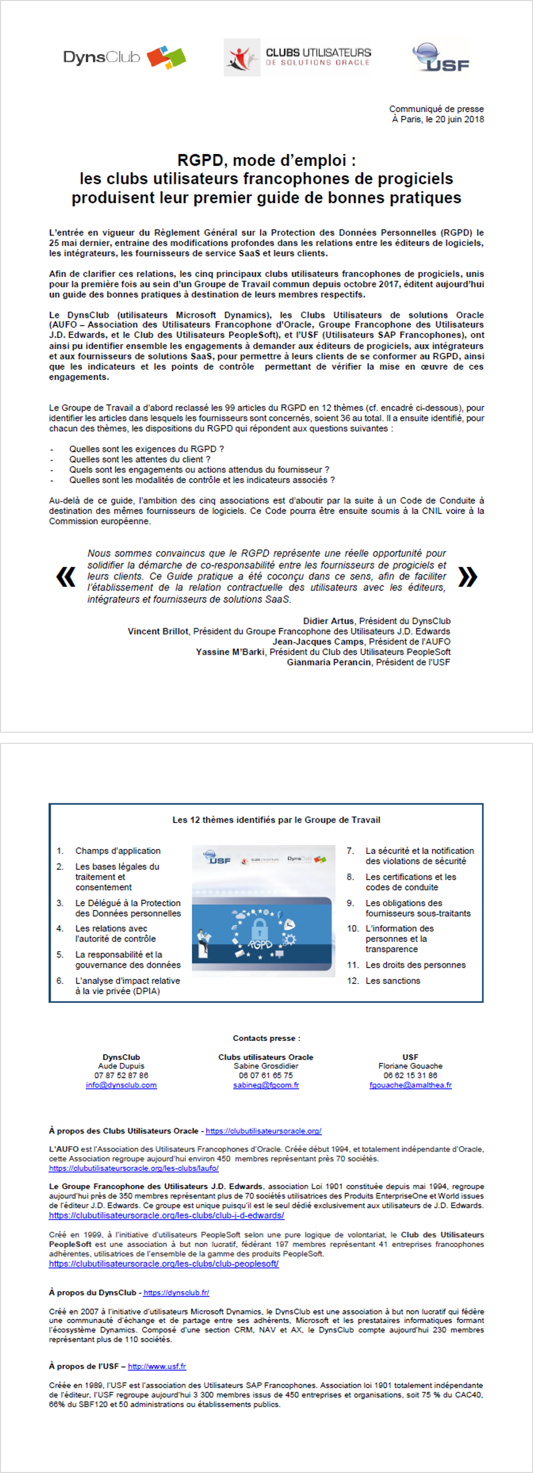 Le DynsClub (utilisateurs Microsoft Dynamics), les Clubs Utilisateurs de solutions Oracle (AUFO – Association des Utilisateurs Francophone d’Oracle, Groupe Francophone des Utilisateurs J.D. Edwards, et le Club des Utilisateurs PeopleSoft), et l’USF (Utilisateurs SAP Francophones), s’unissent pour produire un guide de bonnes pratiques RGPD_