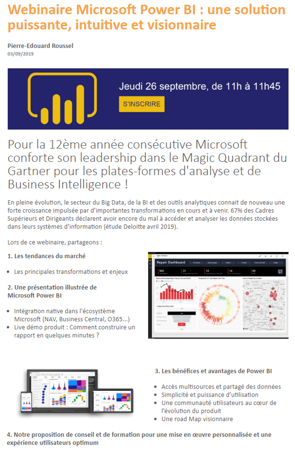 Cosmo Consult vous invite le jeudi 26 septembre de 11h00 à 11h45, à un webinaire dédié à Power BI. Au cours de celui-ci vous pourrez vous informer sur les tendances du marché de la BI, bénéficier d’une démo live du produit, et mesurer les bénéfices et avantages de Power BI. Inscrivez-vous vite !